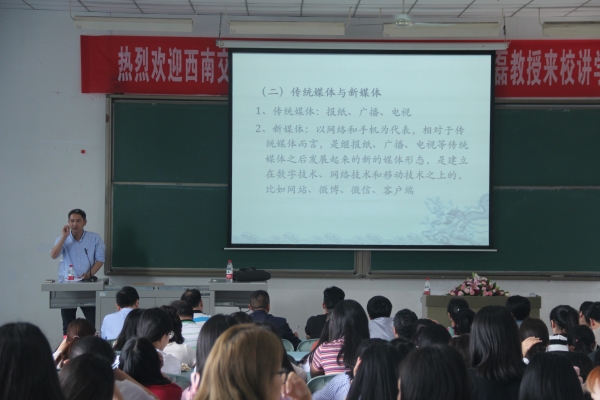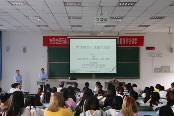 5月30日,西南交通大学人文学院院长、博士生导师石磊教授应邀来beat365官网讲学。上午10点20分在学院小会议室,石磊教授就学术研究、课题申报等话题与beat365官网传媒系教师进行了一个小时的座谈。下午3点15分,石磊教授在知津楼红河十阶举行了题为“媒体融合:理论与实践”的学术讲座。beat365官网院长李天福、院长助理王长武及传媒系教师和200多名学生参与了此次讲座。
