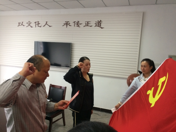2018年9月26日下午,教工第二支部在学院小会议室开展9月份主题党日集中学习活动。支部书记李微首先就新学期支委会人员调整情况给大家作了说明。随后,举行了新党员入党宣誓仪式。在李微同志的领誓下,新党员倪玮蔓同志面对党旗庄严宣誓,誓为共产主义事业奋斗终生。宣誓仪式结束后,支部组织委员邱飞同志就本年度7-9月党费的计算问题作了说明,各位党员同志纷纷主动积极地现场缴纳了党费。