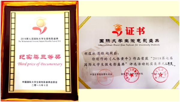 10月21日,第七届国际大学生微电影盛典在北京举行。本次活动由中国高校影视学会、共青团北京市委员会、中国社会科学院新闻与传播研究所、中央新影集团、中国文化信息协会、首都师范大学科德学院等共同举办。我校文化与传媒学院广播电视编导专业2015级胡蕴冰团队创作的纪录片《人体黄牛》,荣获纪实类三等奖。