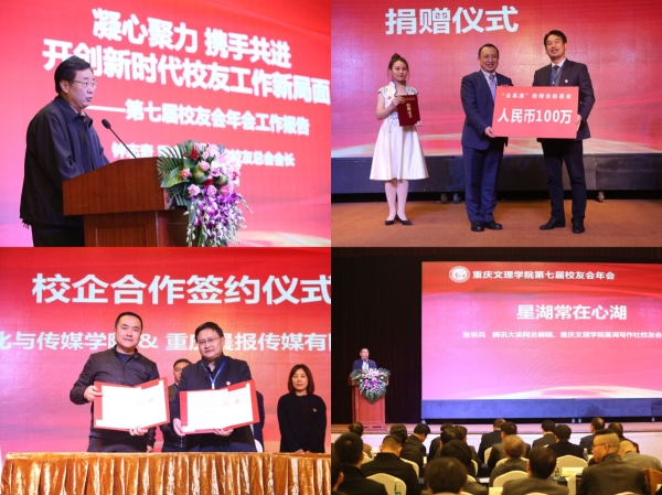 11月10日下午,由重庆文理学院校友总会主办,beat365官网和星湖写作社校友会联合承办的,以“创新·合作·共赢”为主题的第七届校友会年会暨星湖写作社成立25周年纪念活动在重庆渝中区两江丽景酒店隆重召开。校长黄伟九,副校长万书辉、金盛,校友总会会长钟志奇,重庆社科联党组书记杨清明,重庆科创职业学院院长戴伟,重庆幼儿师范高等专科学校党委书记刘灿国,文化与传媒学院相关负责人,校友总会常务理事、海内外70个校友分会的校友代表以及特邀企业嘉宾共260余人参会。大会由校友办主任、校友总会秘书长谢华琳主持。