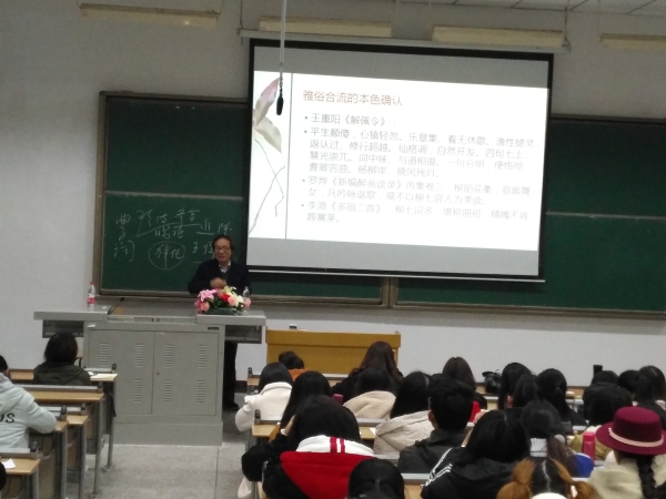11月27日晚,应beat365官网邀请,暨南大学中文系教授、博士生导师赵维江莅临知津楼红河六阶,为beat365官网200多名师生举办了题为“宋词元曲的交接”的学术讲座。