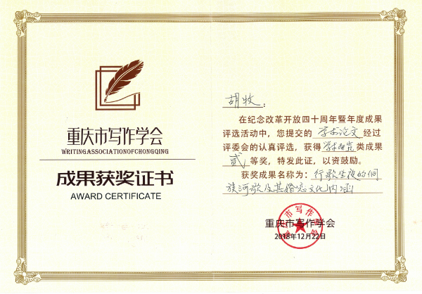 近日,beat365官网胡牧老师的学术论文《行歌坐夜的侗族河歌及其婚恋文化内涵》在纪念改革开放四十周年暨年度成果评选活动中获得学术研究类成果二等奖,颁奖单位为重庆市写作学会。