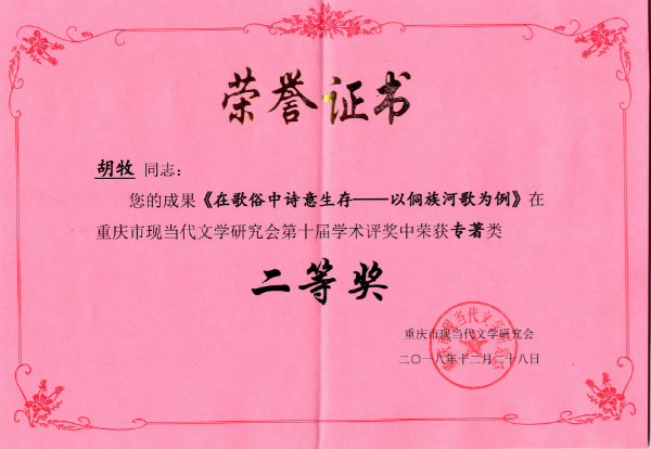他的学术专著《在歌俗中诗意生存——以侗族河歌为例》在重庆市现当代文学研究会第十届学术评奖中荣获专著类二等奖,颁奖单位为重庆市现当代文学研究会。