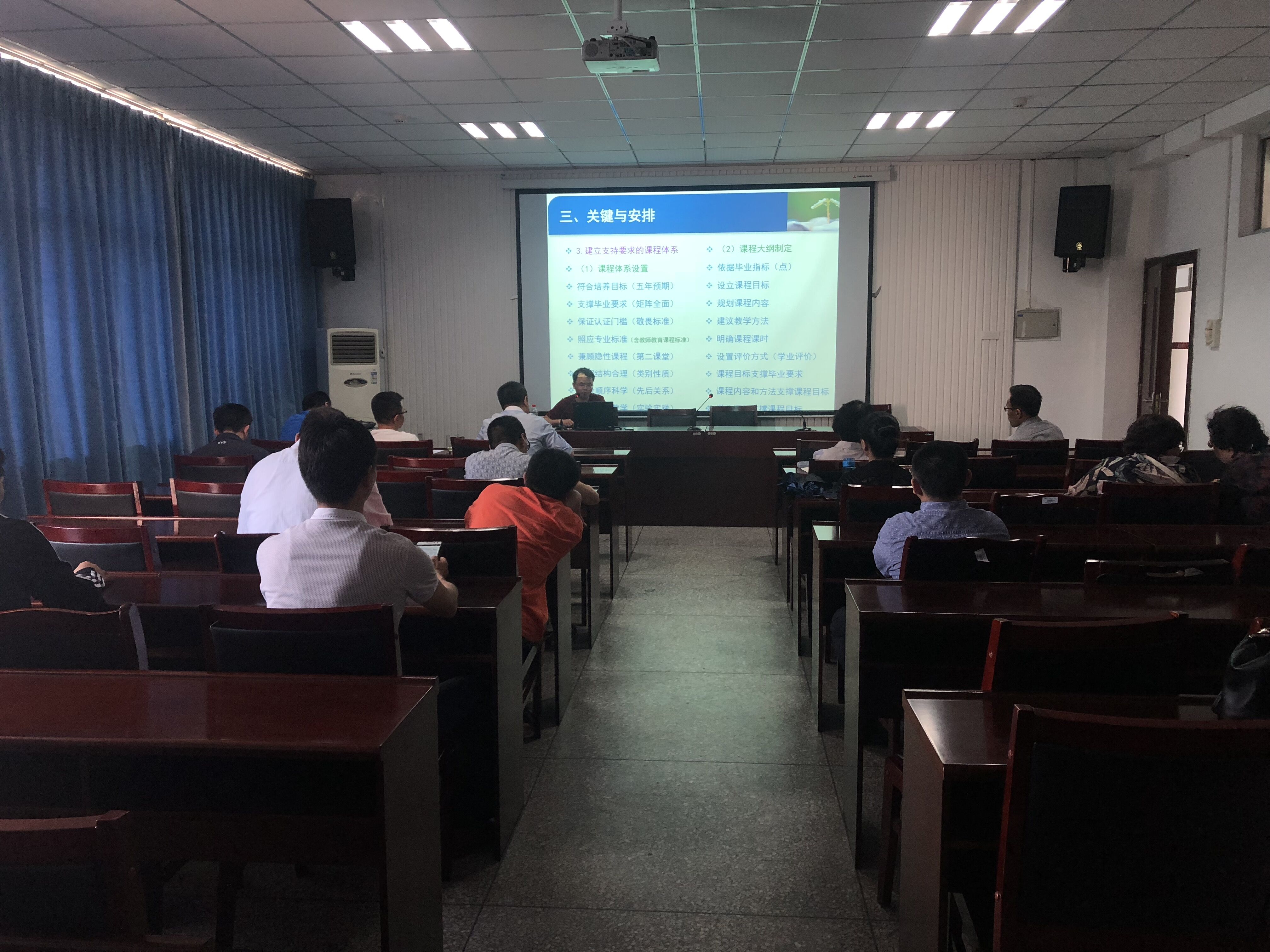 此次培训由中文系主任黄贤忠主持,特别邀请到西南大学文学院认证工作资深负责人占如默博士主讲。占如默博士的培训主要分为两个阶段。第一阶段占博士首先就师范认证理念,强调课程改革、建立相应课程体系的必要性,围绕培养目标介绍了课程目标、毕业要求、培养目标三者之间的逻辑支撑关系。第二阶段则是对课程大纲撰写的必备要素和框架结构进行详细讲解,占博士强调要基于毕业指标来制定课程目标、规划课程内容、选择教学方法,几个方面相辅相成,方能达到教学目的和要求,同时占博士结合西南大学教学经验,介绍了课程大纲中对考核评价的要求。培训最后,中文系教师就培训内容积极询问,占博士均详细解答,获益匪浅。