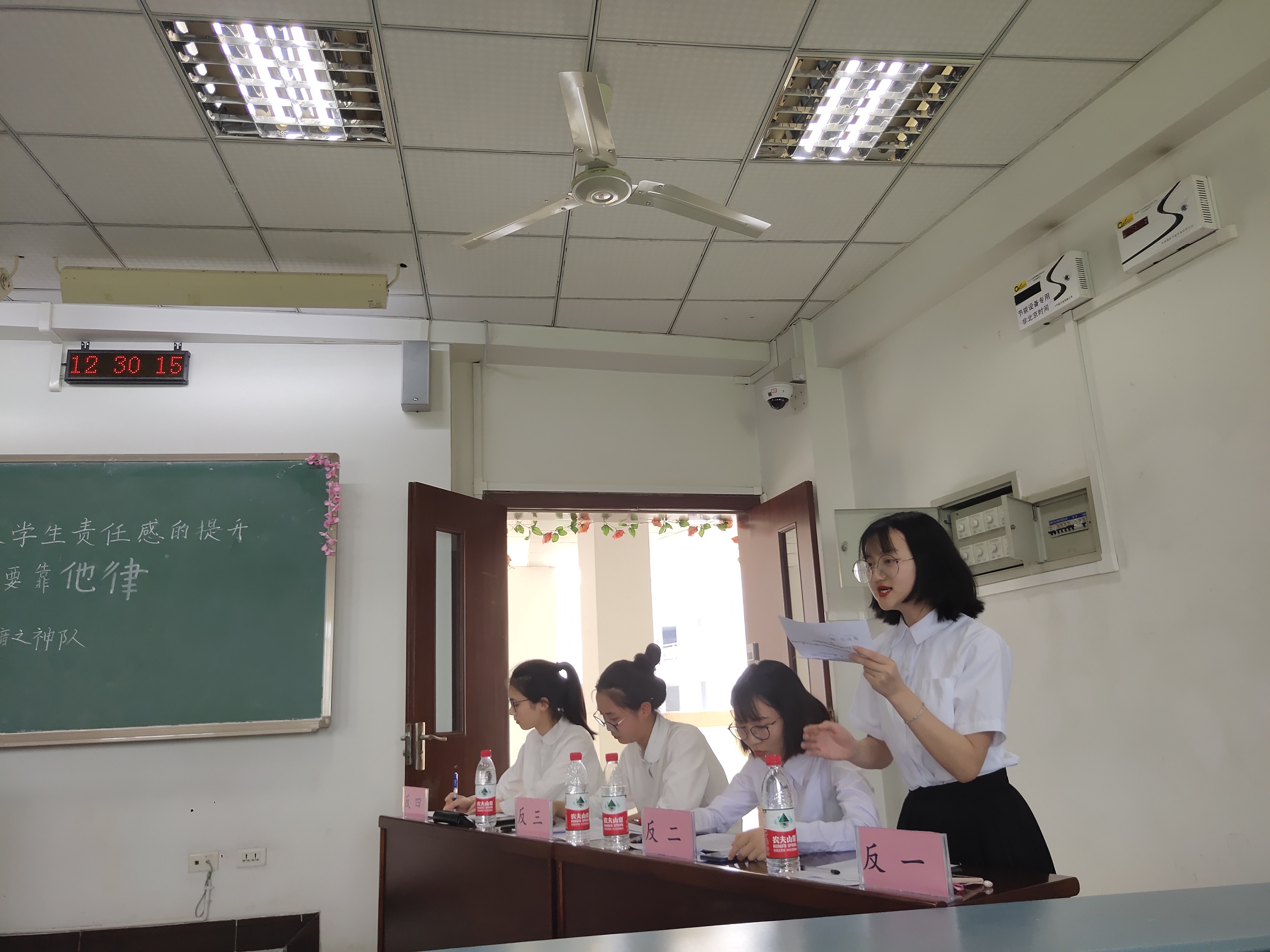 比赛共分初赛、复赛、决赛三部分,经过激烈的层层角逐,18级广播电视学专业辩论队和18级汉语言文学师范专业辩论队闯入决赛。在决赛阶段,双方就“当代大学生责任感的提升主要靠自律还是他律”的问题展开辩论。正方广电代表队认为当代大学生责任感的提升主要靠自律,而反方汉师代表队则坚持主要靠他律的观点。双方选手在立论、质询、攻辩和小结等各个环节中思路清晰,引经据典,字字珠玑,使现场气氛迅速升温。在随后的自由辩论中,双方选手就辩题展开更深层次的辩论,选手们个个妙语连珠,舌绽莲花,一次次将比赛推向高潮。最终,18级汉语言文学师范专业代表队获得胜利,来自18级广播电视学专业的周洋娟摘得“最佳辩手”的称号。