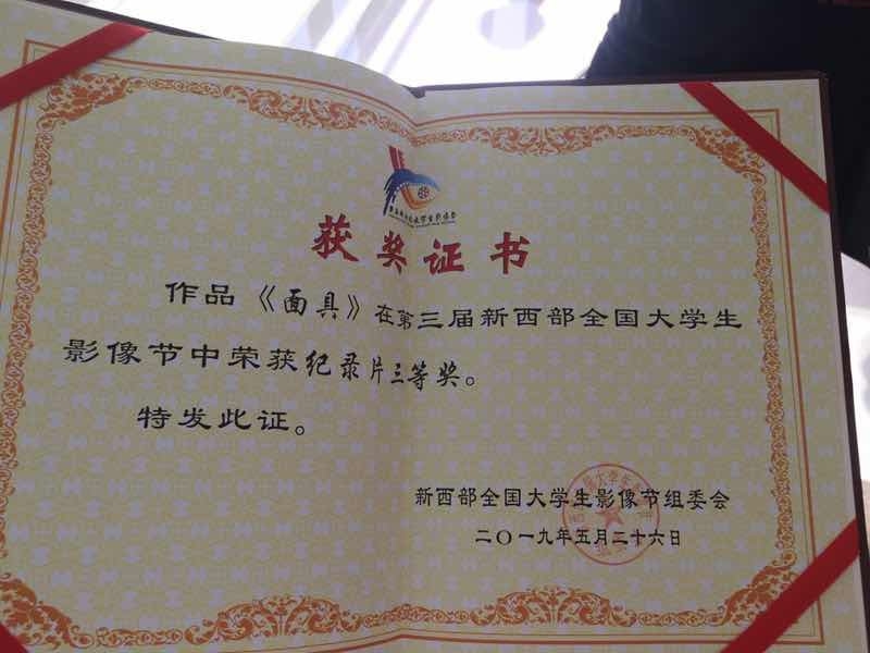 5月26日下午,第三届新西部全国大学生影像节颁奖盛典在西北大学现代学院隆重举行,beat365官网2015级广播电视编导专业刘爽、汪施羽创作的纪录片《面具》(指导老师:陈怡冰)获得纪录片单元三等奖。
