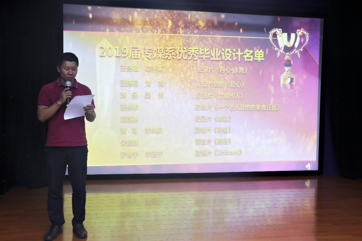 颁奖典礼后,大家集中观影了本年度优秀作品代表作《列车将至》。主持人管灿公布了部分2019届传媒系优秀毕业设计名单,放映了本届毕业设计作品代表作《Unicorn》《竹编传人》《城边》。