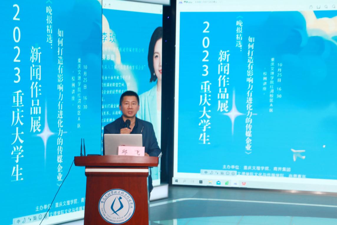 邱飞首先致欢迎词,然后介绍了李玫的重要业绩及经历,讲述了本次讲座的背景意义,引导传媒学子要跳出传统的专业思维,从经济等新角度去认识传媒行业。他强调,从经济方面和创新创意方面来理解传媒是一个新颖的角度,发展创新思维、创新能力,这也顺应了时代和行业的发展。同时,学生应从多角度认识世界,从多角度挖掘自己的潜能,找准自己的定位。他表示,由我校和商界集团共同开展的重庆大学生新闻作品展大赛获得了重庆多所高校的大力支持,各校学生参赛活跃度高。希望能通过与商界集团联合举办重庆大学生新闻作品展评选活动提高同学们对主流媒体的认知,培养同学们新闻采写等多方面的能力。