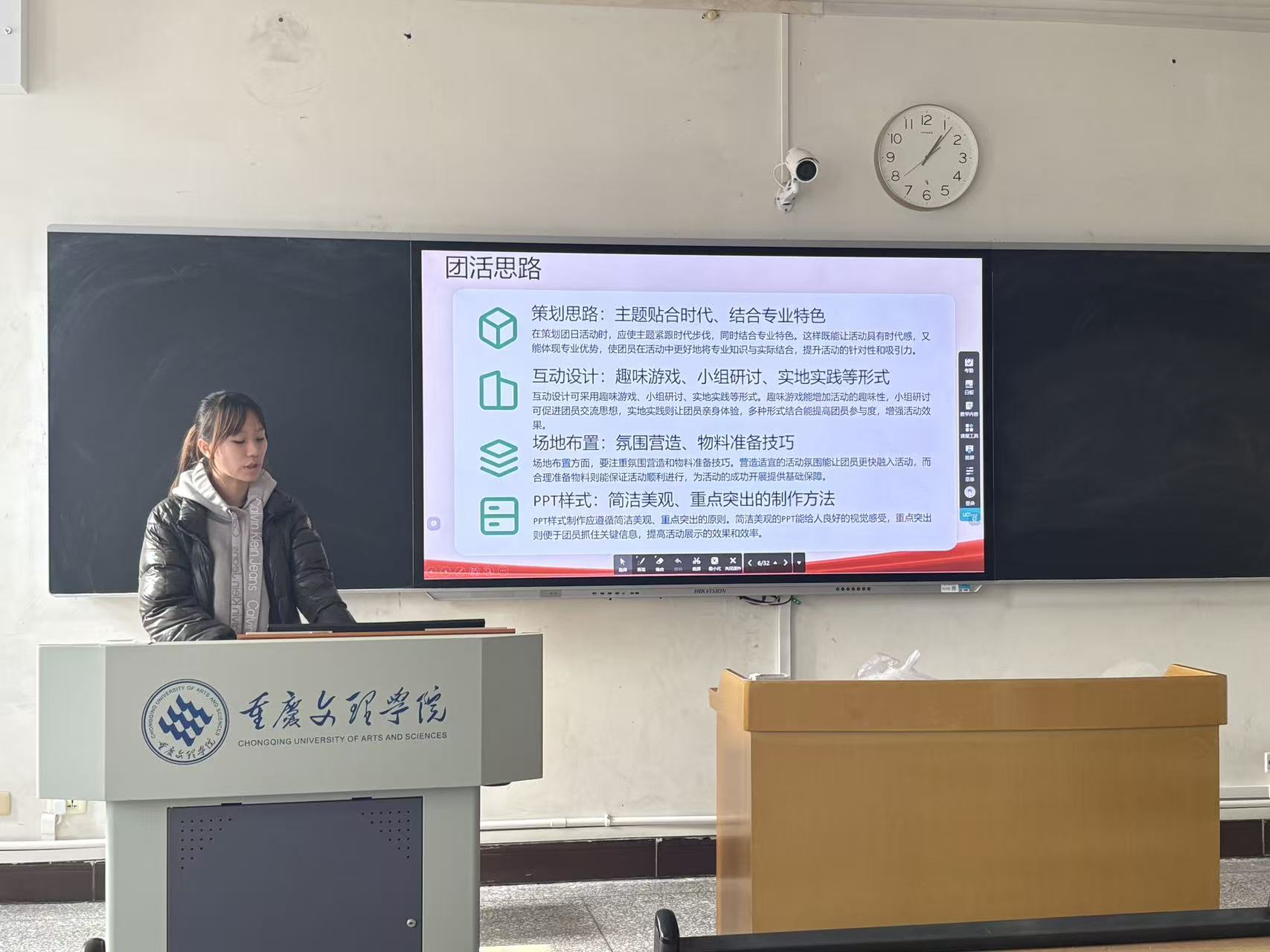 在优秀经验分享环节,学院优秀团支书代表刘娉婷、荣思嘉懿结合自身工作实践,带来了干货满满的经验分享。两位代表从团活主题策划的“破圈思路”、流程设计的“细节把控”、氛围营造的“互动技巧”、团员动员的“精准方法”等多个维度展开详细讲解,重点分享了如何结合文化传播、设计类专业特色,打造兼具思想性与趣味性的团活内容。例如将专业实践、志愿服务与团活主题深度融合,通过小组共创、成果展示等互动形式增强团员参与感,以及如何规范做好活动考勤、资料归档、效果反馈等日常工作。分享过程中,她们还通过案例展示、成果图片分享等方式,直观呈现了特色团活的开展成效,为在场学生骨干提供了可借鉴、可复制的实践样本,现场交流氛围热烈。